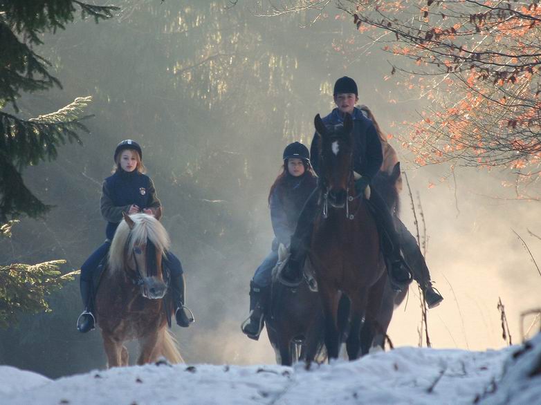 Hübsche junge Damen hoch zu Roß im Winterwald am Eichelsberg.